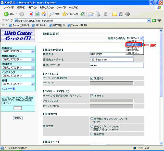 - 「編集する接続先」から、「接続設定2」を選択します。