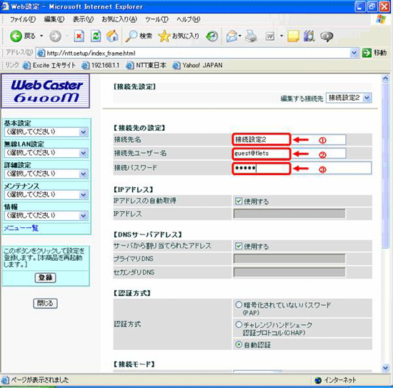 - 「接続設定2」にフレッツ・スクウェアの設定を行います。