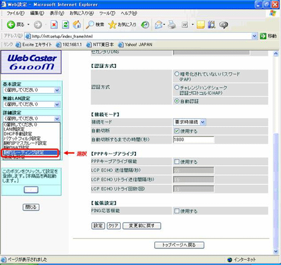 - メニューの「詳細設定」から、「静的ルーティング設定」を選択して下さい。