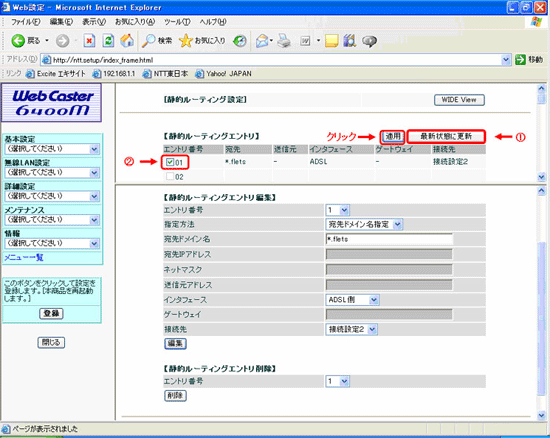 「静的ルーティングエントリ」に手順13で設定した内容が表示されます。 -