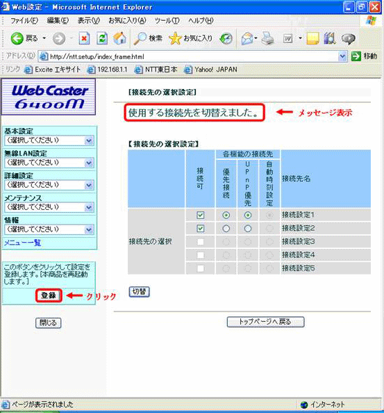 - 「使用する接続先を切替えました。」とメッセージが表示されます。
