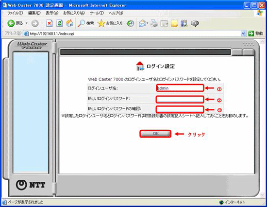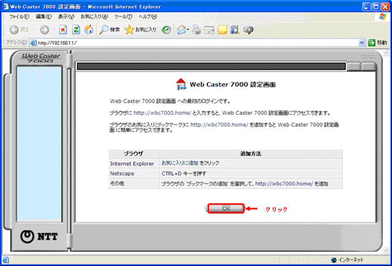 - WBC7000 をはじめて設定する場合、「WebCaster7000設定画面」が表示されます。