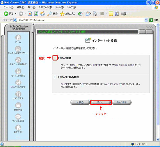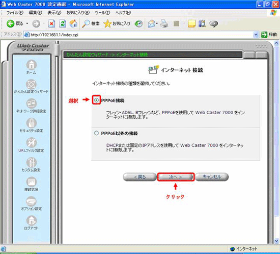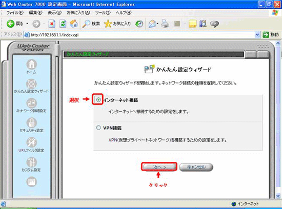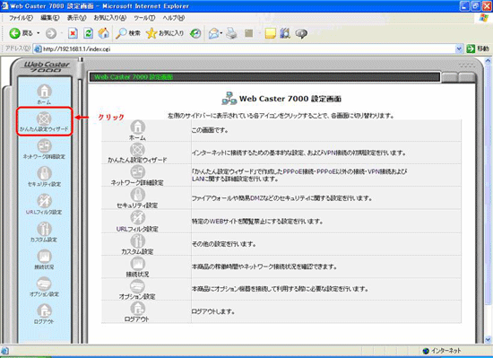 - 「WebCaster7000設定画面」の左側メニューより「かんたん設定ウィザード」を選択します。