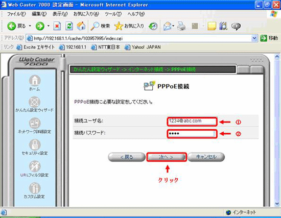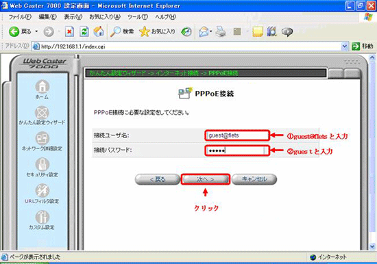 - 「PPPoE接続」画面よりフレッツ・スクウェアの設定を行います。