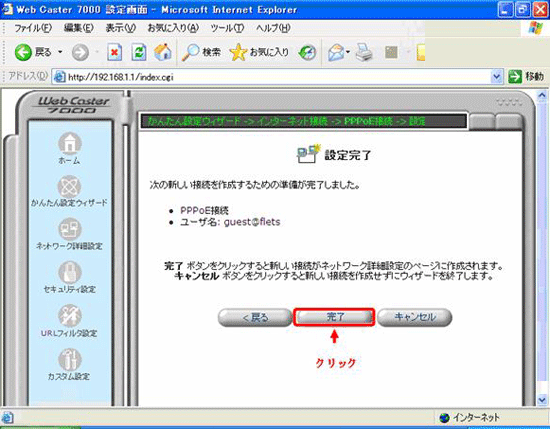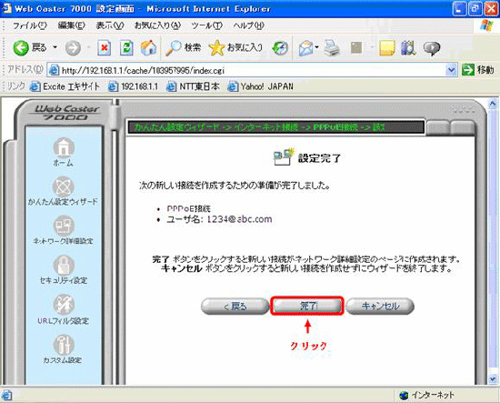 - 「設定完了」画面で内容を確認し、「完了」をクリックして下さい。