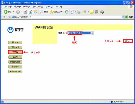 - 左側のメニューから「WAN」をクリックし、接続タイプで「マルチPPPoE」を選択し「次へ」をクリックします。