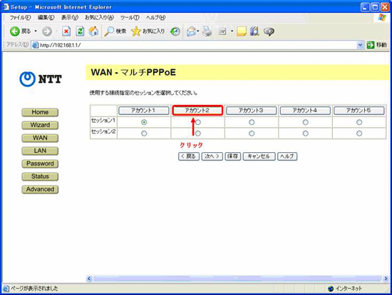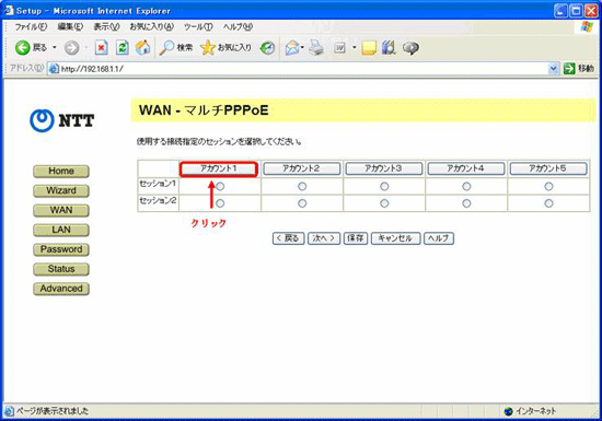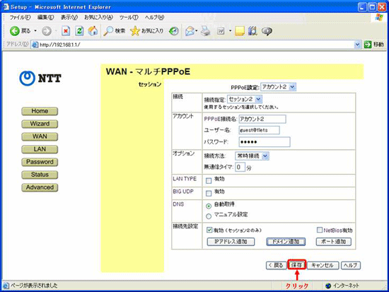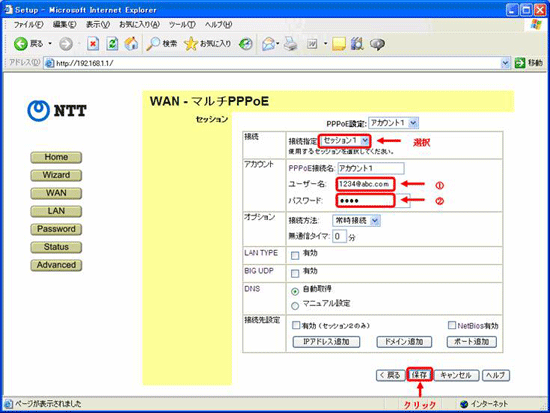 - 接続の項目で「セッション1」を選択し、ISPの情報を入力します、情報の入力が終わったら、「保存」をクリックします。