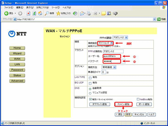 - 接続の項目で「セッション2」を選択し、フレッツ・スクウェア接続の情報を入力します、情報の入力が終わったら、「ドメイン追加」をクリックします。