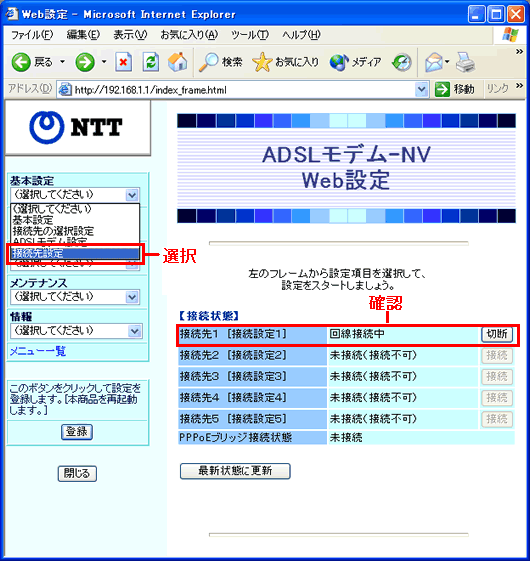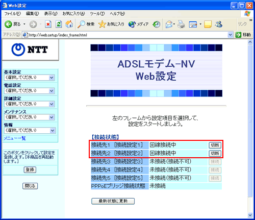 - ※「接続先1」が「回線接続中」と表示されている事を確認します。