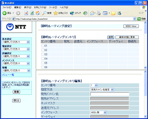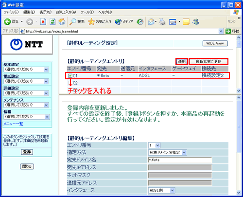 - 「最新状態に更新」ボタンをクリックすると「静的ルーティングエントリ」項目に設定内容が表示されます。