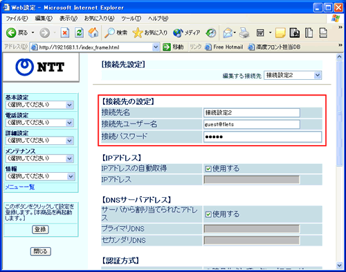 ここでは、接続設定1にプロバイダ接続、接続設定2にフレッツ・スクウェア接続の設定をする方法をご紹介します。