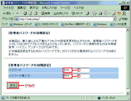 - 「管理者パスワードの初期設定」画面が表示されます。パスワードを入力し、「設定」ボタンをクリックします。