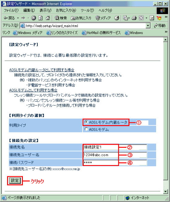 まずは、プロバイダ(ISP)への接続設定を行います。 情報の入力が終わったら、「設定」ボタンをクリックします。