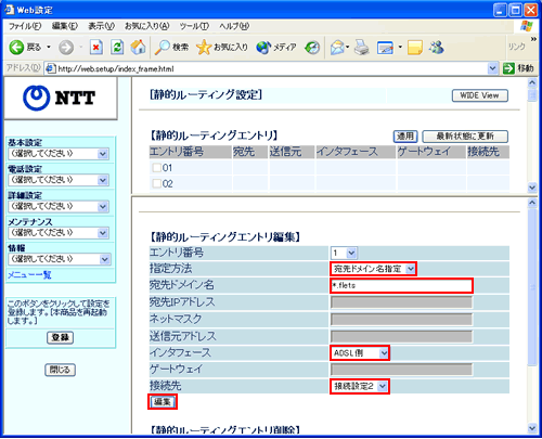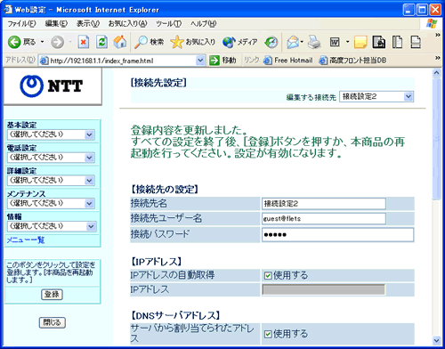 - ブラウザにて「http://www.flets/」へアクセスすることで、接続先2の接続設定で接続され、