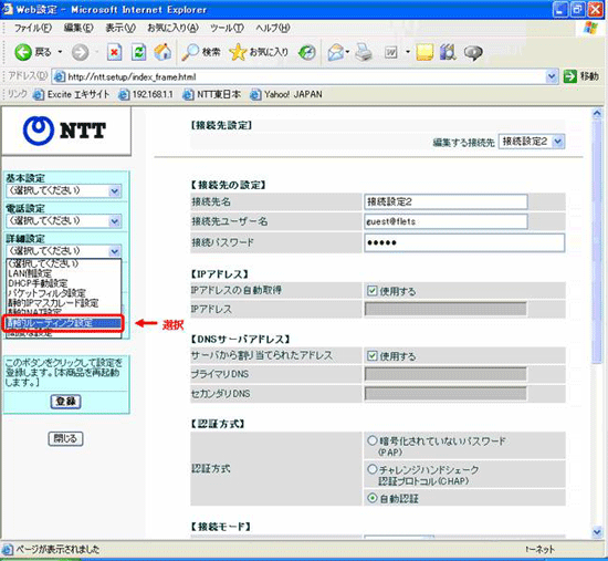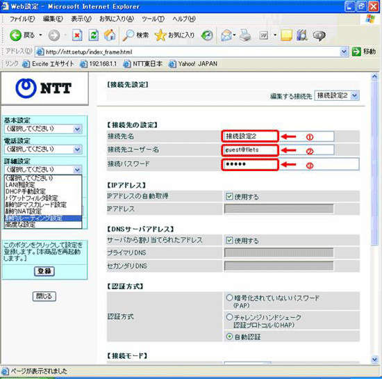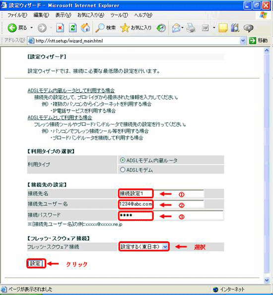 - 「接続設定2」にフレッツ・スクウェアの設定を行います。