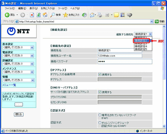 - 「編集する接続先」から、「接続設定2」を選択します。