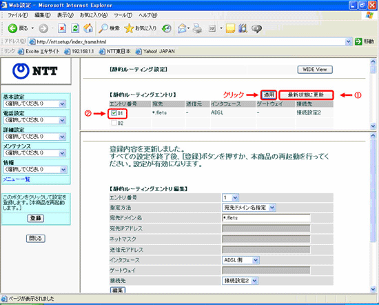 「静的ルーティングエントリ」に手順13で設定した内容が表示されます。