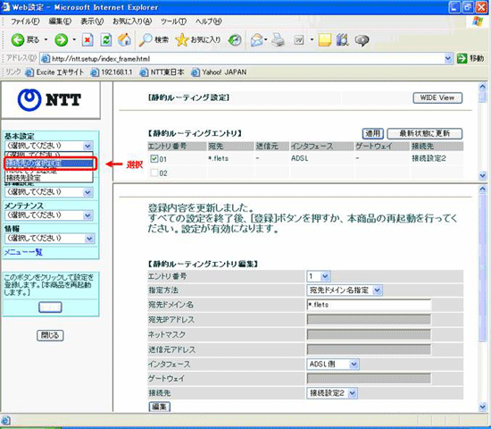 - メニューの「詳細設定」から、「静的ルーティング設定」を選択して下さい。