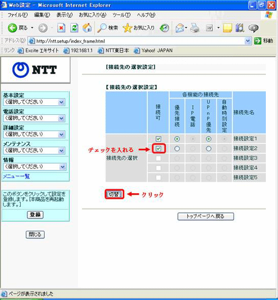 「切替」をクリックして下さい。- ※「接続設定1」の「接続可」の欄には、あらかじめチェックが入っています。