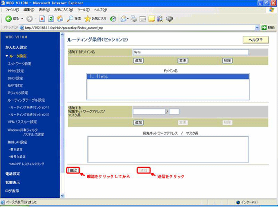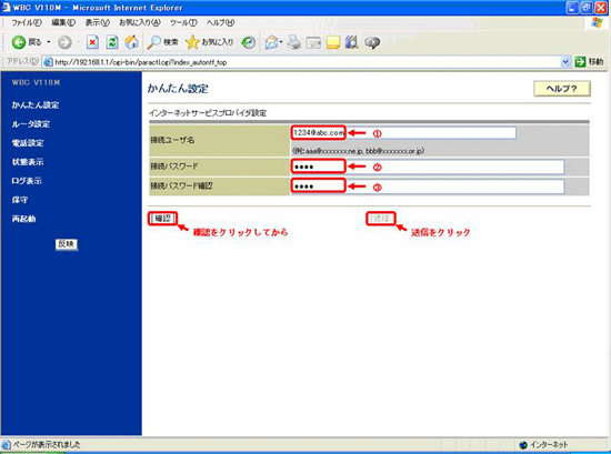 - 情報をWBC V110Mに送信するため「確認」をクリックしてから「送信」ボタンをクリックして下さい。