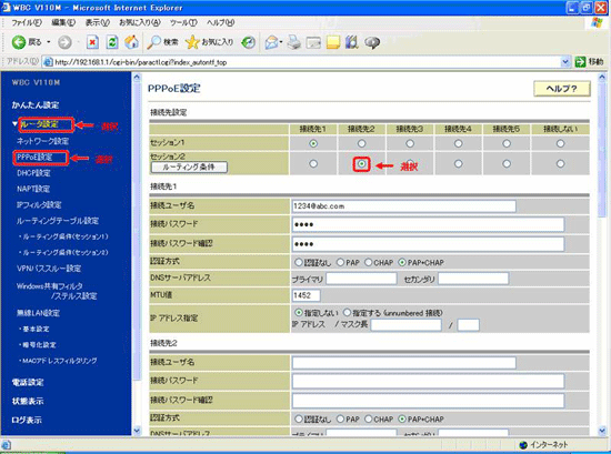PPPoE設定画面が表示されたら、接続先設定の、セッション2の項目で「接続先2」を選択します。