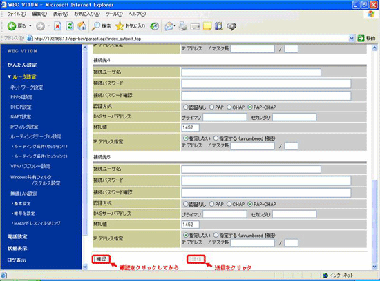 - 情報の入力が終ったら、PPPoE設定画面の一番下にある「確認」をクリックしてから「送信」ボタンをクリックして下さい。