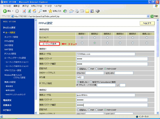 - PPPoE設定画面の1番上の部分を表示させ、セッション2の「ルーティング条件」ボタンをクリックして下さい。