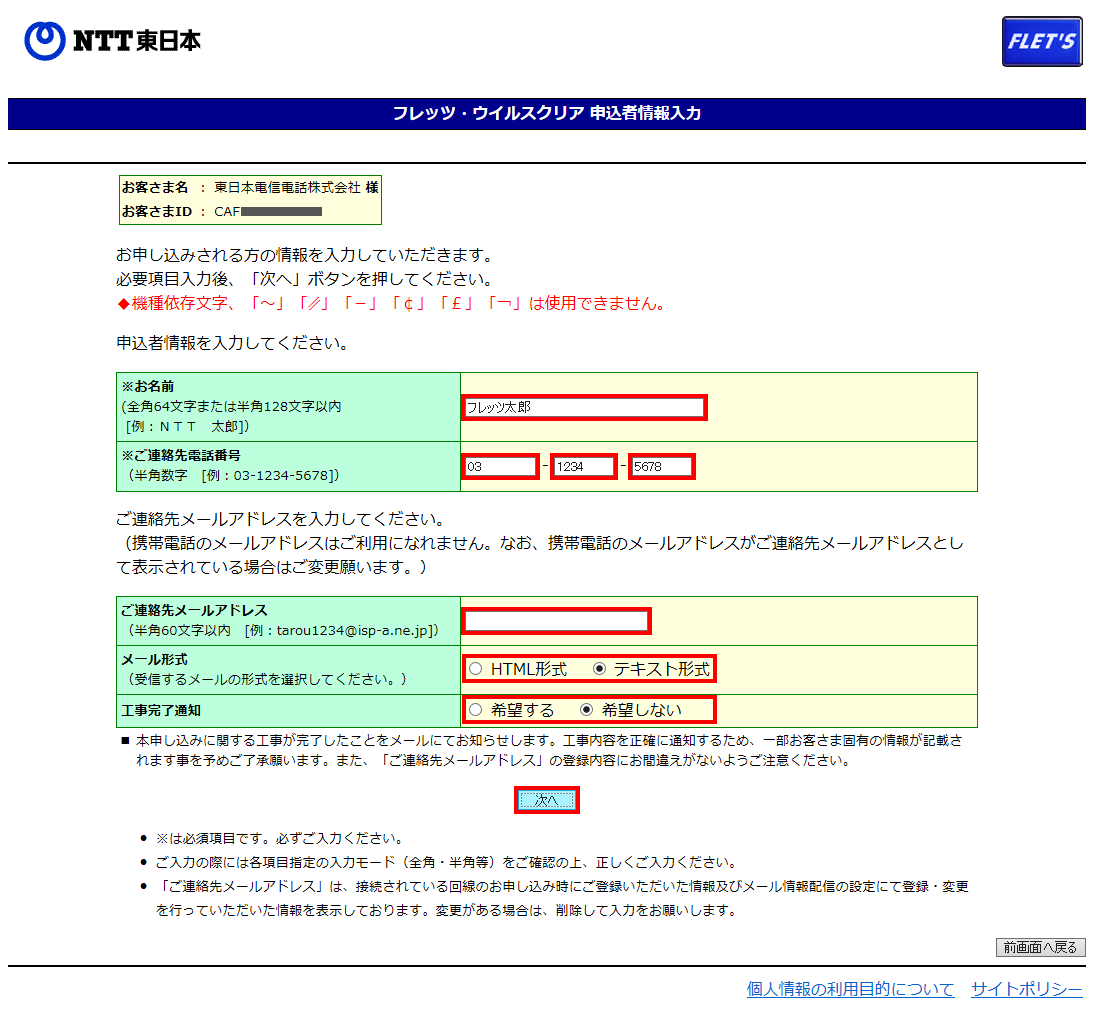 項目 説明 お名前 申込者の名前を入力してください。 ご連絡先電話番号 申込者のご連絡先電話番号を入力してください。 ご連絡先メールアドレス 申込者のご連絡先メールアドレスを入力してください。(任意) メール形式 「HTML 形式」または「テキスト形式」からお選びください 工事完了通知 「希望する」または「希望しない」からお選びください