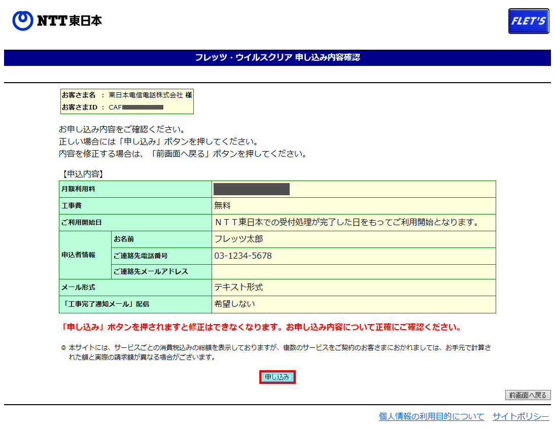 - 申し込み内容確認画面が表示されます。