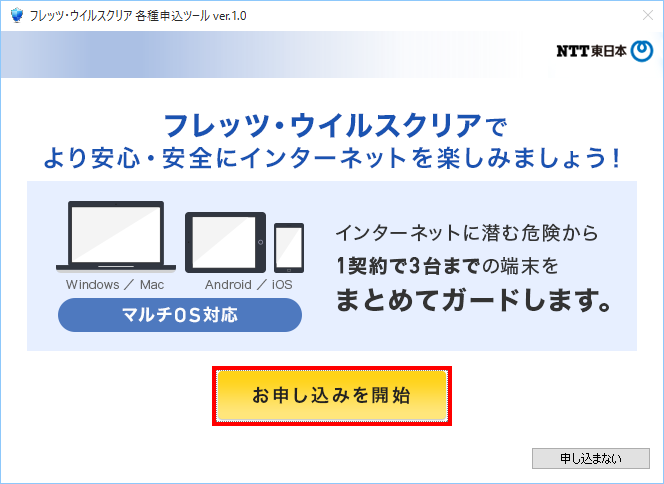 インストールした「フレッツ・ウイルスクリア 各種申込ツール」でご利用のお申し込みをします。