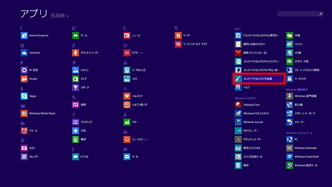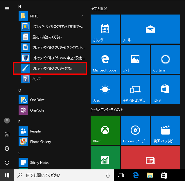 1. アプリ一覧に【フレッツ・ウイルスクリアを起動】の項目がある方は、フレッツ・ウイルスクリアのWindows対応クライアントツールをご利用中です。