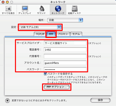 【PPP】タブをクリックし、インターネットサービスプロバイダから通知された情報を入力してください。
