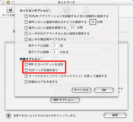 【PPPエコーパケットを送信】、【TCPヘッダ圧縮を使う】のチェックをはずし、その他必要なオプションを設定してください。