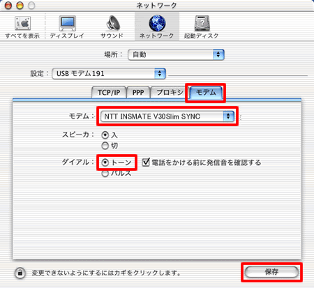 モデム 同期64kbpsに対応したものを選択してください。 ダイアル 【トーン】を選択してください。 設定が済みましたら、【保存】をクリックしてください。
