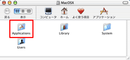 デスクトップ上のハードディスクのアイコンをダブルクリックし、開いたウィンドウ内の【Applications】フォルダをダブルクリックしてください。