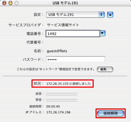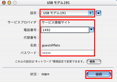 サービス情報サイト(フレッツ網)へ接続する場合、「guest@flets」と入力してください。パスワード インターネットサービスプロバイダに登録されているパスワードを入力してください。