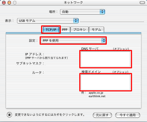 設定 【PPPを使用】を選択してください。 DNSサーバ インターネットサービスプロバイダからDNSサーバアドレスを指定する必要がある場合、インターネットサービスプロバイダから指定されたDNSサーバのIPアドレスを入力してください。 検索ドメイン 必要に応じて設定してください。 -