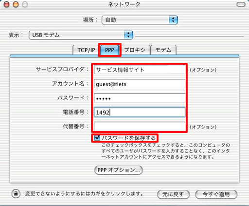 サービス情報サイト(フレッツ網)へ接続する場合、「guest@flets」と入力してください。パスワード インターネットサービスプロバイダに登録されているパスワードを入力してください。