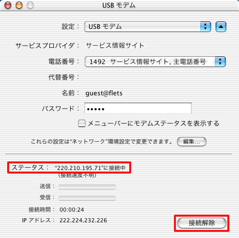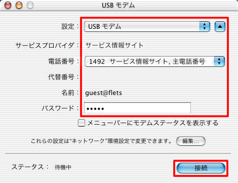 「設定」で【USBモデム】を選択し、「ダイヤルアップの設定」の手順5で設定した「電話番号」、「アカウント名」、「パスワード」が入力されていることを確認して、【接続】をクリックしてください。