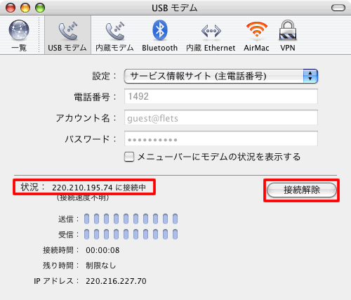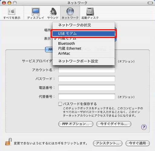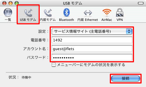 「USBモデム」を開き、「ダイヤルアップの設定」の手順5で設定した「電話番号」、「アカウント名」、「パスワード」が入力されていることを確認して、【接続】をクリックしてください。