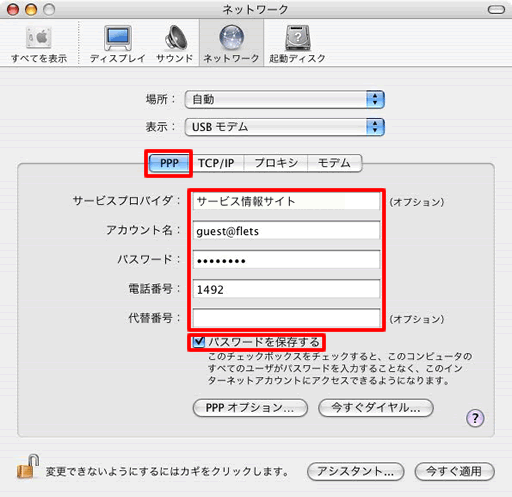 サービス情報サイト(フレッツ網)へ接続する場合、「guest@flets」と入力してください。パスワード インターネットサービスプロバイダに登録されているパスワードを入力してください。
