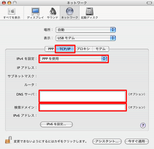 IPv4を設定 【PPPを使用】を選択してください。 DNSサーバ インターネットサービスプロバイダからDNSサーバアドレスを指定する必要がある場合、インターネットサービスプロバイダから指定されたDNSサーバのIPアドレスを入力してください。 検索ドメイン 必要に応じて設定してください。 -
