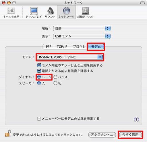 モデム 同期64kbpsに対応したものを選択してください。 ダイヤル 【トーン】を選択してください。 設定が済みましたら、【今すぐ適用】をクリックしてください。