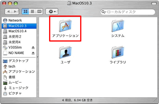 デスクトップ上のハードディスクのアイコンをダブルクリックし、開いたウィンドウ内の【アプリケーション】フォルダをダブルクリックしてください。