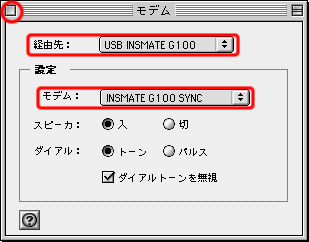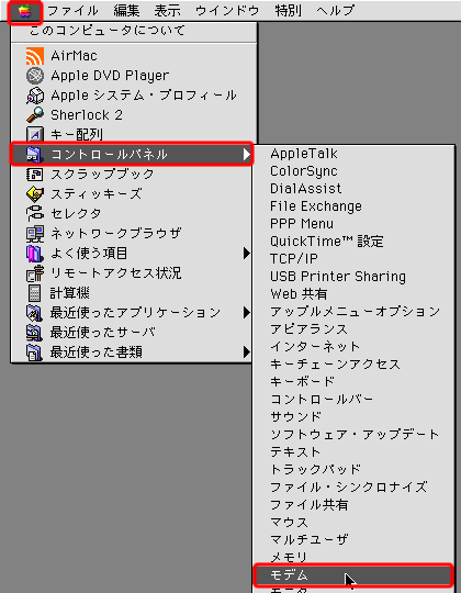 アップルメニューから【コントロールパネル】 - 【モデム】を選択してください。