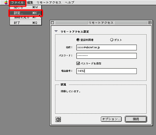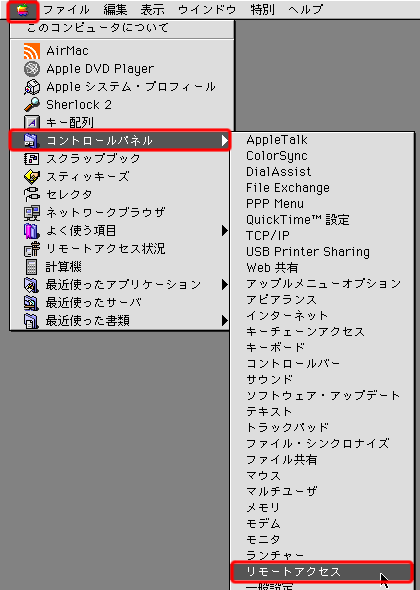 アップルメニューから【コントロールパネル】 - 【リモートアクセス】を選択してください。