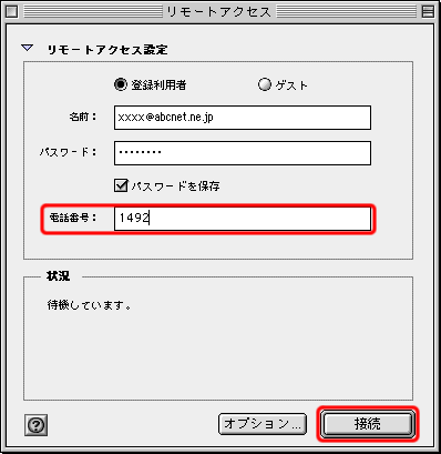 【電話番号】に接続先番号「1492」が入力されていることを確認し、【接続】をクリックしてください。 -