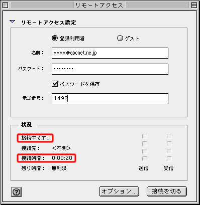 接続が完了すると、【状況】に「接続中です。」と表示されます。また、接続時間が積算されます。