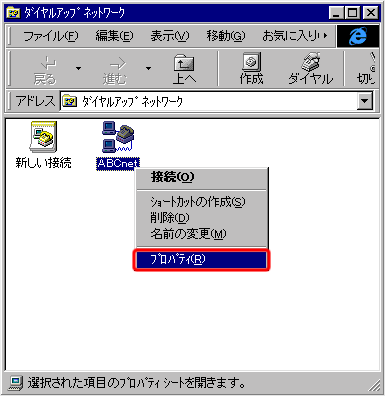 作成した接続のアイコンにポインタを合わせ、マウスの右ボタンをクリックし、【プロパティ】をクリックしてください。