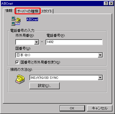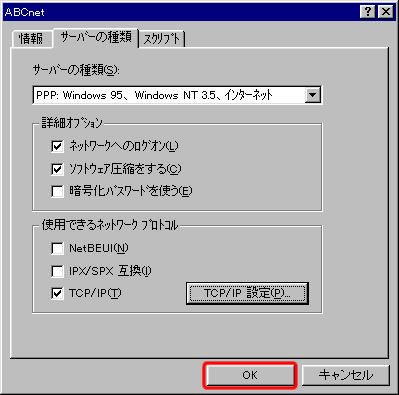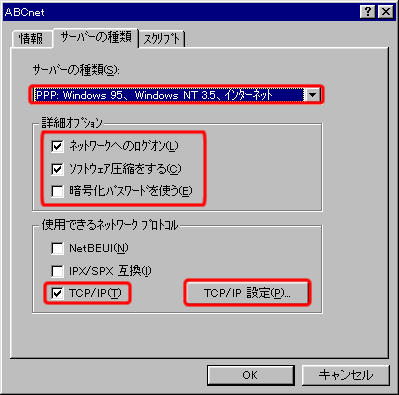 - 【サーバーの種類】に【PPP:Windows95、Windows NT3.5、インターネット】が表示されていることを確認してください。